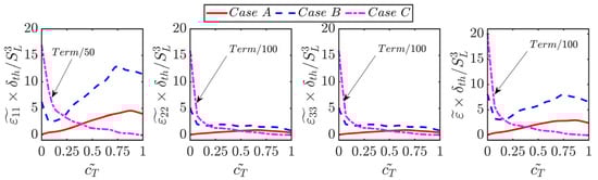 Variations of with for cases A–C. The variations of and are shown in sub-figures in 1st–3rd columns, respectively.