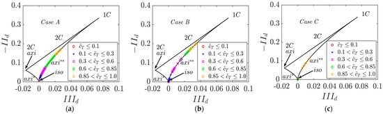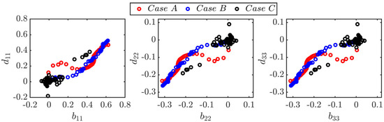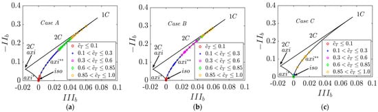 The differences in magnitudes of and in Figure 2 and and in Figure 3 imply that the Reynolds stress and dissipation tensors exhibit a significant level of anisotropy. This has implications for the turbulent flow structure and the modelling of dissipation rate tensor . The anisotropy states of Reynolds stresses are usually characterised by the plots of versus in the form of the Lumley triangle, as shown in Figure 4a–c for cases A–C, respectively, with data points color-coded for different ranges of . Similarly, the corresponding Lumley triangles for the dissipation rate tensor are shown in Figure 5a–c for cases A–C, respectively, at different ranges of . Since the incoming turbulence is isotropic, the flow starts from (0,0) in the diagram and moves along a trajectory. For all cases, both and tensors follow a predominantly two-component axisymmetric expansion state (i.e., and ) with an increase in and the anisotropy state tends towards the one-component side of the two-component axisymmetric expansion branch. The level of anisotropy at the end of the flame brush is the strongest for case A and the weakest for case C, that is, the terminal data points at the burned gas side of the flame brush are significantly closer to the origin for case C. This suggests that the dominant effect of heat release and the associated flame-generated turbulence induce turbulence anisotropy within the flame brush.