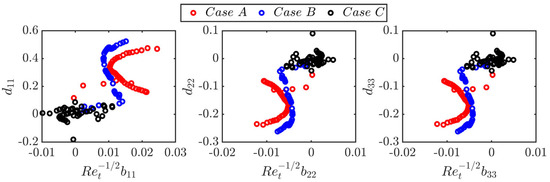 Plots of versus for the dissipation rate tensor in the form of the Lumley triangle for cases (a–c) A–C.