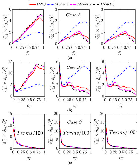 The predictions of according to Equations (4) and (5) with Equations (6a) and (5) with Equation (6b), (i.e., Model 1, Model 2 and Model 3, respectively) are shown along with the values directly computed from DNS data in Figure 8a–c for cases A–C, respectively. It is evident that Model 1 significantly underpredicts , and overpredicts and in cases A and B. On the other hand, both Models 2 and 3 predict and accurately, with some discrepancies on the product side of the flame brush. In case C, since the flame-induced anisotropy is minimal, all three models capture the DNS results accurately throughout the flame brush.