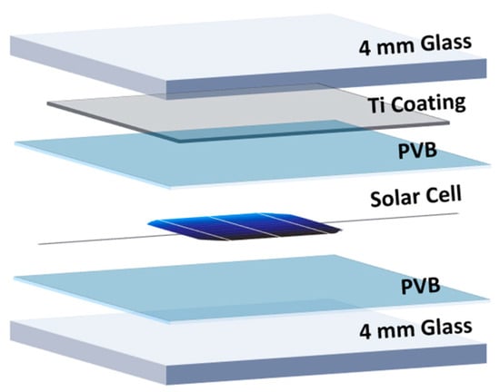 Each photovoltaic module (see Figure 1) was constructed from the following materials in a sandwich-like structure: glass sheet (300 × 300 × 4 mm3), titanium coating, lamination film (PVB), silicon solar cell with ribbon busbars, lamination film (PVB), and glass sheet (300 × 300 × 4 mm3). The 4 mm glass was chosen in the following test because it is typically used in commercially available PV modules due to its favourable weight-to-mechanical strength ratio []. The Ti coating was deposited on the glass surface by a magnetron sputtering method with different thickness values. On both sides of the silicon solar cell, a lamination film of 0.76 mm thickness was used to seal it between two sheets of glass during the lamination process held at a temperature of 160 °C for 1 h. Two ribbons were extended to the outside to allow current-voltage measurements.