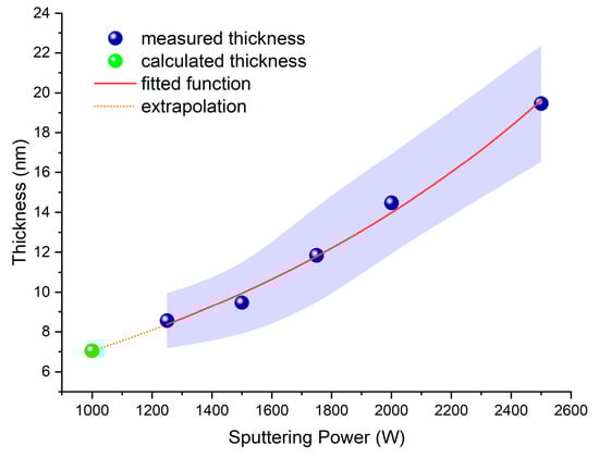 A stylus profilometer was used to measure the thickness of the titanium layer on the glass. According to data obtained, layers prepared with sputtering powers of 1250, 1500, 1750, 2000, and 2500 W were 8.6 ± 1.4, 9.5 ± 1.7, 14.5 ± 2.4, 11.8 ± 2.5, and 19.5 ± 2.9 nm thick, respectively. The purple area presented in Figure 3 shows the measurement uncertainty, which was calculated as a standard deviation for five measurements for each sample. We were unable to measure the thickness of coating prepared with the power of 1000 W; thus, we decided to fit the following exponential function: