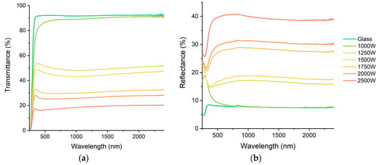 (a) Transmittance and (b) reflectance spectra of different titanium coatings on glass prepared by magnetron sputtering with various sputtering powers.