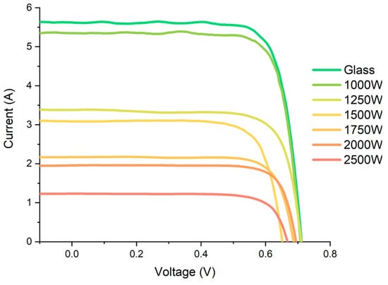 The calculated photovoltaic parameters with calculated errors are shown in Table 2. As presented, open-circuit voltage Uoc decreases when the thickness of titanium coating increases. This was certainly caused by lower solar illumination power. According to other studies, the irradiance could have an impact on Uoc [,], especially when the temperature of the solar cell increases [,]. Thus, the highest value was observed for the PV module with uncoated glass, and the lowest for the module with the thickest Ti layer. They were 712 and 668 mv, respectively—a drop of around 6%. However, a deviation appeared for this parameter that was determined for a module prepared for 1500 W. The most significant difference was observed for short-circuit current Isc. In this case, the decrease for the uncoated glass and the thickest Ti layer was 77%. The value of each sample was 5.61, 5.36, 3.12, 3.04, 2.33, 1.91, and 1.27 A for the uncoated glass and the 1000, 1250, 1500, 1750, 2000, and 2500 W coatings, respectively. This clearly shows how the nano-sized titanium coating relevantly reduces the solar irradiance and affects the performance of the PV module.