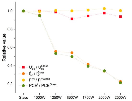 The fill factor FF values did not differ significantly from one another, indicating that the Ti layer did not interfere with the solar cell itself. Its value was in the range from 0.769 to 0.794. The overall performance of the PV modules, measured in terms of power conversion efficiency PCE, was as follows: 19.8, 18.8, 10.6, 9.9, 7.8, 6.8, and 4.2% for the uncoated glass and the 1000, 1250, 1500, 1750, 2000, and 2500 W coatings, respectively. There was a slight decrease in efficiency between the uncoated glass and the sample prepared with the sputtering power of 1000 W. However, the layer prepared with the power of 1250 W reduces the PCE significantly by about 46% (compared to the reference module). As shown in Figure 6, the changes observed for successive titanium layer thicknesses were much smaller.