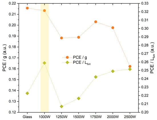 Relative values of PCE/g and PCE/Ltuv for different thicknesses of titanium coatings. Highlighted 1000 W sample showed best performance.