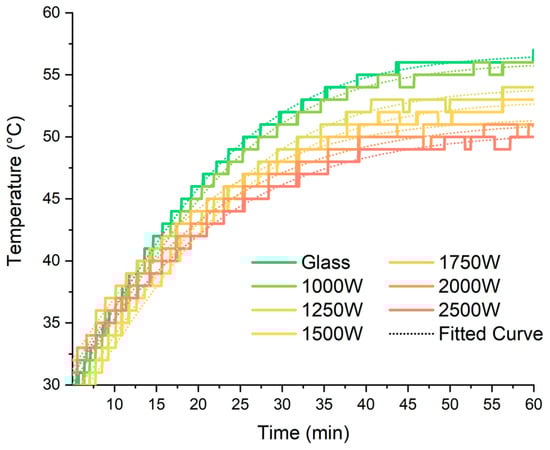 The heating process of the modules was examined under a 1 SUN illumination. The thermocouple was attached to the glass behind the solar cell. The measurement lasted one hour, as shown in Figure 8. To the data obtained, the following function was fitted