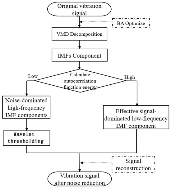 Flowchart of vibration-signal noise-reduction method based on BA-VMD combined with wavelet thresholding.