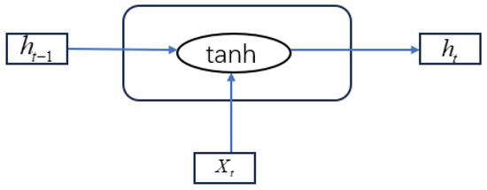 The LSTM neural network is a variant neural network based on the recurrent neural network (RNN) [25]. In traditional neural network design, the nodes in each layer do not interact with each other, and the information transfer between layers is usually carried out in a fully connected manner. In contrast, the neurons in the hidden layer of a recurrent neural network (RNN) are interconnected and influential, which allows the RNN to preserve information about previous states when processing data, forming what is known as “memory” [25]. The neuron structure of the RNN is shown in Figure 3, where the input of the current moment and the output of the hidden layer of the previous moment jointly determine the input of its hidden layer, and the information of the previous point in time continues to influence the current computational process. This mechanism makes the RNN show a greater advantage in processing time-series data. However, the RNN also has problems; if it encounters a time series that keeps expanding and growing, it may encounter the problem of gradient decay or gradient explosion, which limits its effectiveness in processing long-sequence data, thus affecting the ability to extract effective information from long time series.