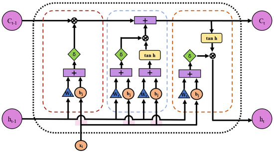 The updating and maintenance of the unit state is carried out smoothly through specific architectures, including forget gates, input gates, and output gates. These three gate structures are like three control valves that can filter and adjust the input and output information of the implicit layer to promote the long-term maintenance of information [28]. The following are the specific steps for the LSTM network: