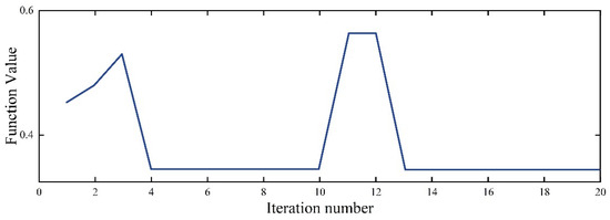 In this study, the vibration signals obtained from the actual monitoring of pumped-storage units are used as inputs to carry out the research, aiming to verify the effectiveness of the proposed noise-reduction method based on the BA-VMD and wavelet-thresholding techniques, and the experimental results were analyzed in detail. In the research process, the optimization of VMD parameters were mainly completed by the BA algorithm. Through many iterations of adjustment, the parameters of the BA algorithm were finely tuned until the optimal settings were reached. The optimized parameters are bat population size m set to 15, iteration period N is 20, and default value of 0.9 used for both the acoustic loudness attenuation rate and pulse frequency enhancement coefficient. During the optimization iteration process, the trend of the minimum value of the arrangement entropy of the IMFs is shown in Figure 5, and it can be observed that, in the 13th iteration, the arrangement entropy of the IMFs reaches the minimum value, which is 0.3447, and the corresponding optimum value parameter combinations are as follows. The corresponding optimal value parameter combination at this time is [10,4766]. This indicates that through the optimization of the BA algorithm, the VMD is able to identify and separate the noise components more effectively when processing vibration signals, thus improving the accuracy and efficiency of signal processing.