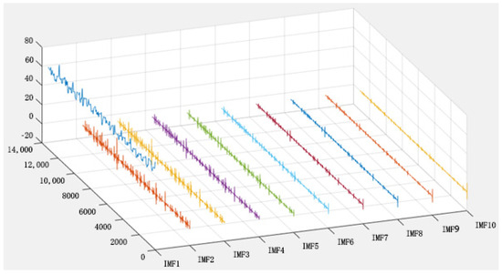 Setting the [K,α] parameter combination value as [10,4766], by applying the VMD technique to the vibration signals of the noise-affected pumped-storage unit, 10 intrinsic modal function components were successfully separated in this study, as shown in Figure 6.