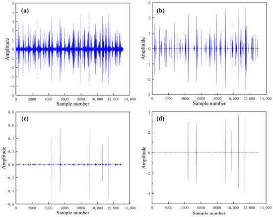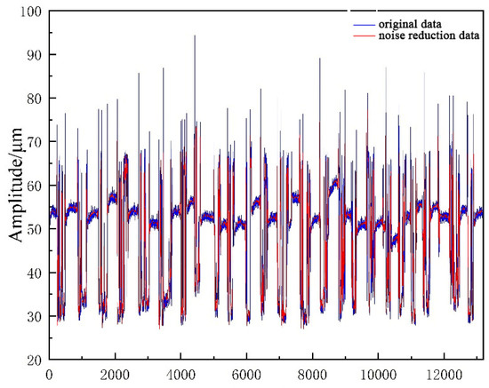 In this paper, three methods are chosen to determine the threshold including: fixed-threshold criterion, hard-threshold function, and soft-threshold function. A higher signal-to-noise ratio (SNR) means a lower proportion of noise and thus better noise reduction [29,30]; the smaller the root mean square error (RMSE) value, the better the noise-reduction effect, indicating that the signal after noise reduction is closer to the original signal. Through the RMSE and SNR evaluation indexes listed in Table 2, it can be clearly seen that the soft-threshold function noise reduction has the largest SNR (2.8528) and the smallest RMSE (15.2867), which has the best noise-reduction effect. The reconfigured noise-reduction signal is shown in Figure 8.