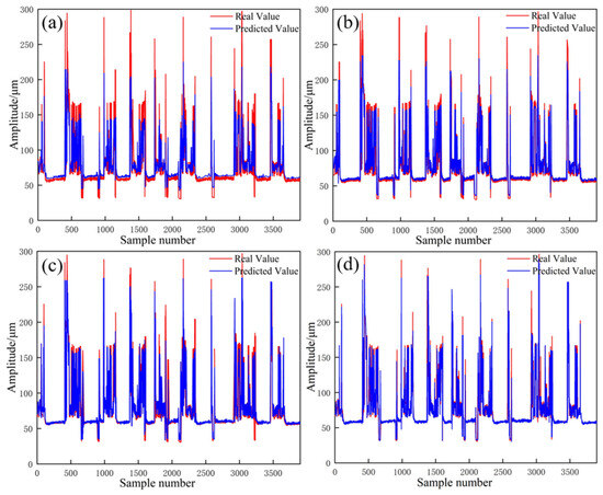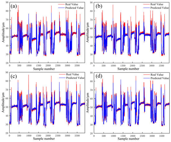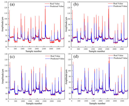 Plot of predicted results of different models for the upper guide bearing. (a): CNN model prediction results, (b): SVR model prediction results, (c): BP model prediction results, (d): LSTM model prediction results.