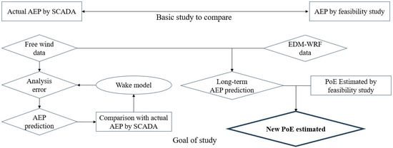 Figure 1 shows the flowchart of this study. This paper compared and analyzed the annual energy production (AEP) obtained using actual SCADA (supervisory control and data acquisition) data with the annual energy production (AEP) obtained from the feasibility study, such as the output power, wind speed, wind direction, and other environmental variables. With this comparison, we determined whether the power production was at an appropriate level while the wind farm is operating.