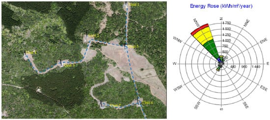 The S wind farm is located at an altitude of 400 to 445 m on the mid-mountainous area of Halla mountain in the southeast of Jeju Island. The high-altitude Halla mountain is located in the northwest direction from the wind farm, on terrain where the altitude gradually increases in the direction of Halla mountain. In Figure 2, the wind turbine layout and energy density are presented by direction.