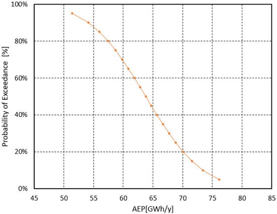 The wind data obtained from 15:00 on 1 November 2013 to 16:40 on 20 October 2014 were analyzed. According to the analysis results, the average annual wind speed was predicted to be 6.73 m/s at a hub height of 117 m, and the gross AEP was calculated as 79,614 MWh/y. The capacity of the wind farm for this study is 25.2 MW, and 79,614 MWh/y represents a capacity factor of 36.1%. Here, the capacity factor refers to the ratio of energy production to turbine capacity and is used as one of the evaluation indicators of a system or wind farm. The aet AEP, considering a loss rate of 19.9%, was calculated at 63,776 MWh/y, with a capacity factor of 28.9%. As shown in Figure 3 and Table 1, the AEP corresponding to P75 is 58,704 MWh/y, with a capacity factor of 26.6%. And, the AEP corresponding to P90 is 54,138 MWh/y, and the capacity factor is 24.5%. The uncertainty was assessed to be 11.8%. Here, P75 and P90 are the probabilities of exceedance (PoEs), which means that there are 75% and 90% probabilities of generating more than a certain amount of power generation statistically.