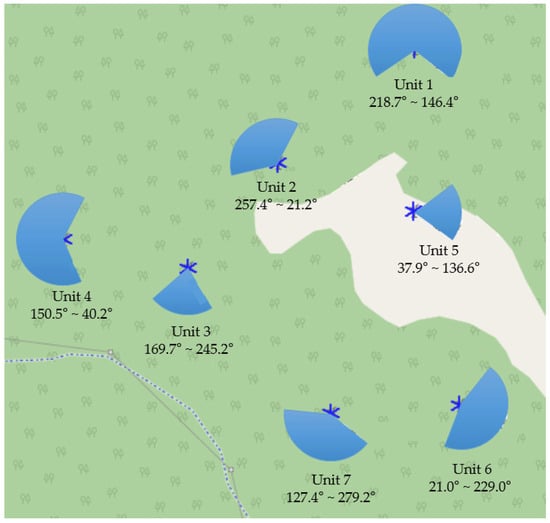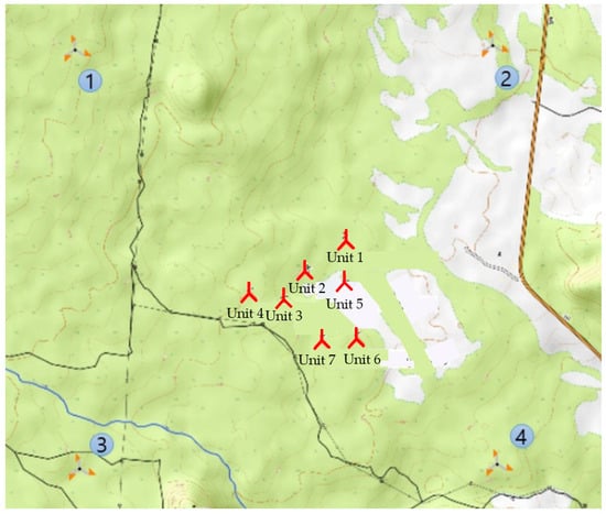 Seven wind turbines of the same type are installed in the wind farm. The rated capacity of one wind turbine is 3.6 MW, and the total capacity of the wind farm is 25.2 MW. Wind turbine unit 1 is located at the top right of the wind farm, and units 6 and 7 are located at the bottom. Unit 4 is located on the left, and units 2, 3, and 5 are located inside the wind farm. The wind rose for energy density is highest in the west-northwest (WNW) direction, so it is believed that the wind turbines were placed with this in mind at the time of wind farm development. The wind turbines with the lowest wake effect from the adjacent wind turbines appear to be units 1 and 4, and those with the highest wake effect appear to be units 6 and 7. The separation distance of the wind turbines was found to be 250 m to 350 m, and when expressed in terms of the blade diameter (D) of the wind turbine, it ranges from 2D to 2.5D.