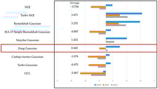 Figure 5 shows the calculation results of the analysis errors for each wake model, and there were no consistent results by year. So, from Figure 5, the Zong Gaussian model with the lowest absolute value of 0.442% among the three-year averages was finally selected, and the estimated AEP was obtained [12,13,14,15,16].