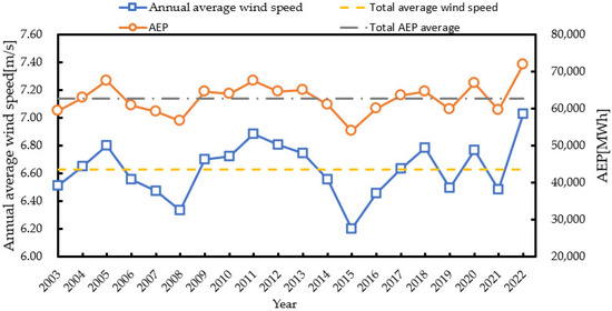 Figure 7 and Table 8 show the annual average wind speed and AEP calculation results obtained by performing MCP. The lowest annual average wind speed (6.20 m/s) and AEP (54,208 MWh) were found in 2015, and the highest annual average wind speed (7.02 m/s) and AEP (72,092 MWh) were found in 2022. The average annual wind speed and AEP were 6.63 m/s and 62,887 MWh.