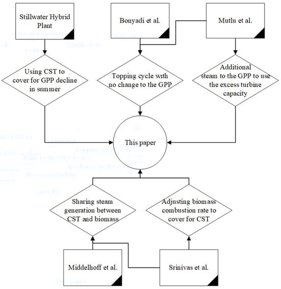 To the authors’ best knowledge, there is no previous study in the open literature on the triple hybridization of CST, geothermal, and biomass. The primary example of an actual hybrid solar and geothermal plant is the Stillwater plant in the US [14]. This hybrid plant uses solar resources to deal with Issue 2. Separately, Bonyadi et al. analyzed a PTC-powered topping cycle using a steam Rankine cycle coupled to an existing binary GPP and showed that this strategy enabled the hybridization of an existing binary GPP without requiring changes to the binary GPP power block [15]. The present work strongly builds on the work by Mutlu et al. that explored and assessed opportunities to hybridize geothermal with biomass [16]. In particular, the OR properties used in the present work are obtained from that paper. Moreover, Mutlu et al. showed that the OR-driven topping cycle can generate additional power and supply additional steam flow to a GPP bottoming cycle to utilize the excess turbine capacity. Srinivas et al. [17] and Middelhoff et al. [18] studied CST–biomass hybridization and showed a case where the CST and biomass parts generate steam concurrently, and those two steam flows run a shared steam turbine. A similar methodology is also used in this study. Srinivas et al. also showed that by varying the biomass combustion rate, it is possible to generate a variable steam generation that can be used when the solar resources are insufficient, which also adds additional flexibility and dispatchability to the system [17]. As a summary, the literature review and how they affected this paper can be found on Figure 1. In light of this literature review, a hybrid system is designed on the TRNSYS environment so that a hybrid CST–biomass topping cycle is utilized by using a PTC field as the CST technology and OR as the biomass resource. This topping cycle generates additional power using a steam Rankine cycle by generating steam from the PTC and OR simultaneously. Furthermore, the excess heat from this topping cycle and energy using biomass supplies additional steam flow to the IPT of KZD-2 GPP, serving as the bottoming cycle.