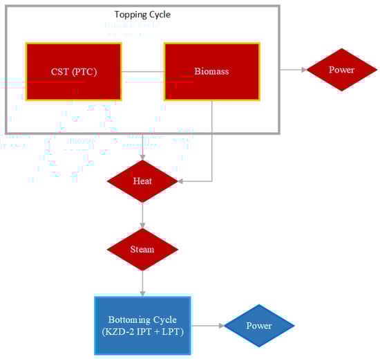 The CST technology used in this study is the Parabolic Trough Collectors (PTCs), whereas the biomass source used is the local OR. The reasoning behind these selections is given later in the literature review. OR is found mainly between October and February when olives are harvested [8,9]. OR can also add additional flexibility as the combustion rate can be varied when needed. Issue 1 can be addressed by supplying additional steam flow to the GPP turbines to utilize the excess turbine capacity. Issue 2 can be mitigated using CST as the solar resource peaks during summer. Moreover, geothermal can also make up for the deficiencies of CST and biomass, hence creating a synergistic hybridization. The addition of CST and biomass to the system will be performed through a topping cycle to the existing KZD-2 so that the topping cycle can operate at higher temperatures and pressures, compared to KZD-2, and thus, it is a better exergetic use of these resources [7]. More details will be shared on the topping cycle approach in the Section 2. The synergistic hybridization and the benefits stemming from each RE technology are summarized in Table 1.