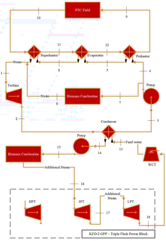 Figure 3 shows the detailed schematic of the hybrid plant. All elements above the dashed box are additional components added by this hybridization, with the exception of the WCT, which belongs to the KZD-2. The topping cycle powered by CST and biomass is shown in Figure 3, and the share of steam generation in the topping cycle is illustrated. The topping cycle pump adjusts the water flow rate to the CST or biomass parts. The condenser serves as the connection between the topping and bottoming cycles. The figure also shows that the exit of IPT feeds the LPT.