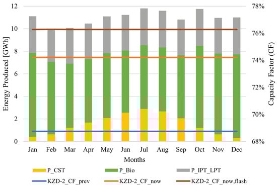 Figure 8 is the annual energy yield of the hybrid plant for each month. Figure 8 shows the increase in CST energy yield during summer months and, in contrast, the decrease in biomass energy yield during the same period. Moreover, the IPT excess turbine capacity utilization is shown to be constant. Figure 8 is essential in showing both resources’ seasonal variance of energy production. Moreover, Figure 8 also shows the Capacity Factor (CF) for the pre- and post-hybridization conditions for both the overall KZD-2 plant and only the flash part of KZD-2, as the binary part is not considered in hybridization. Figure 8 shows the CF increase with added hybridization, which will be discussed in the Section 4.