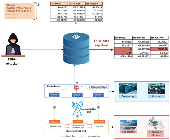 The study highlighted specific vulnerabilities in the way the smart grid estimates its state, and demonstrated how attackers could manipulate measurements to alter the system’s perceived state [13]. The research results indicated that even an attacker with limited information about the grid’s configuration could submit data that would result in state estimation being manipulated in a way that could cause operational problems in the smart grid [14]. A cyberattack of this nature targets a critical system particularly well. It poses such a threat because it deliberately introduces false data into the system. In addition, FDIAs can severely threaten power system security. Power systems are critical infrastructure, and an attack on them can have devastating economic and societal effects.
