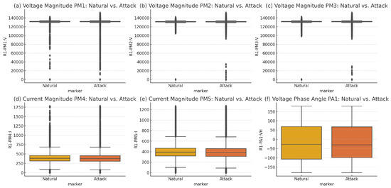 The box plots shown in Figure 3 provide a graphical comparison between natural and attack events for different vital features, including voltage magnitude, current magnitudes, and voltage phase angles. The voltage magnitudes, median values, interquartile range (IQR), and whiskers are almost the same for both natural and attack events. However, there are some outliers in the attack events, but not significantly more than in the natural events, which show irregular voltage behavior during attack events.