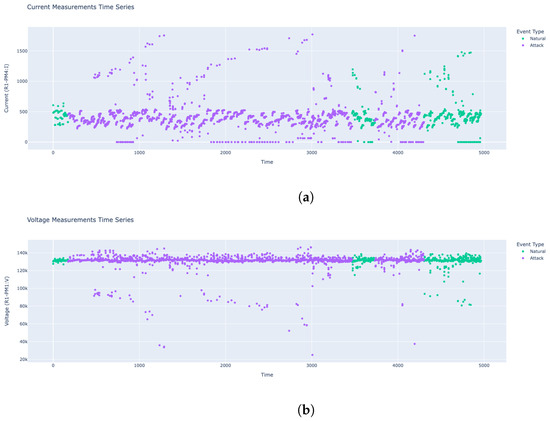 To visualize the behavior of electrical parameters over time, we generated time-series plots of the dataset. For instance, we added a ‘time’ column to create a time-series visualization of the R1-PM4:I column, which represents the Phase A current phase magnitude measured by PMU R1, and the R1-PM1:V column, which represents the voltage magnitude measured by the PMU R1 at a specific location in the power system. The color-coded scatter plot of the distribution of current is shown in Figure 4a. Attack events (purple) appear more frequently throughout the time series. There are some periods with clusters of natural events (green), but they are less common, so during the data cleaning process, we will need to balance the data. The presence of many zero or near-zero values during attacks suggests possible data manipulation or sensor tampering.