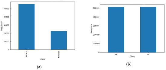 Initially, there were 55,663 attack and 22,714 natural events, as shown in Figure 5a. After applying SMOTE, the distribution of natural and attack events is shown in Figure 5b.