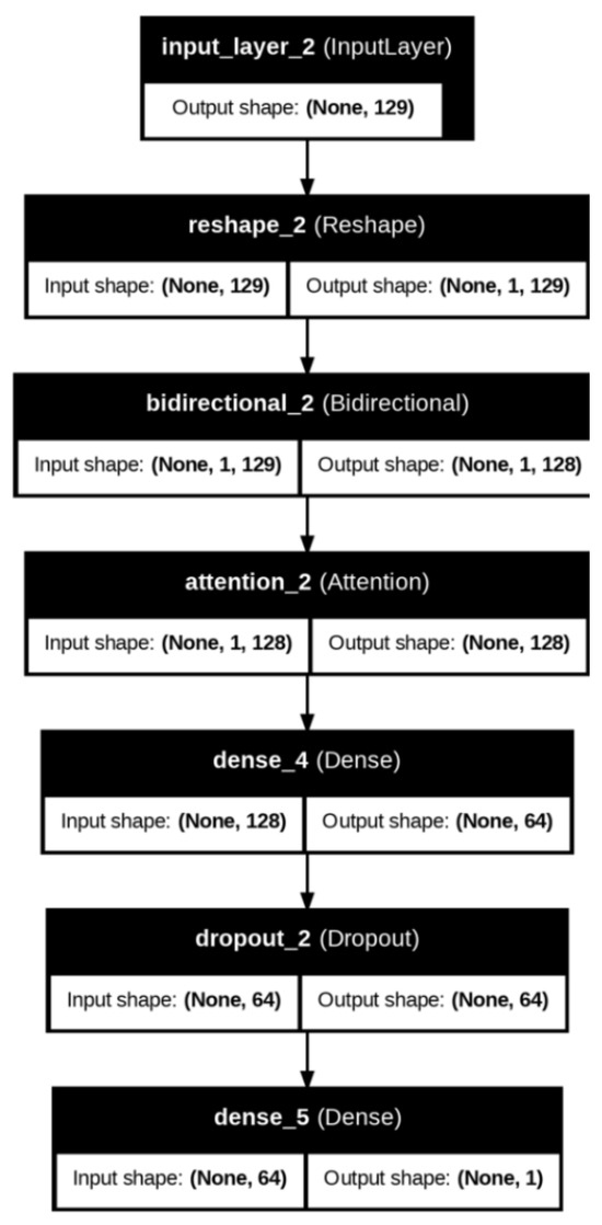 The architecture of the Bidirectional GRU and LSTM with Attention Layer used in our research is depicted in Figure 6. The model starts with an input layer that accepts sequences of length 129. The input is then reshaped to match the requirements of the GRU layer. A Bidirectional GRU layer follows, which processes the input sequence in both forward and backward directions. This helps in capturing dependencies from both past and future contexts within the input data. The output of this layer is a sequence with 128 features. The attention mechanism is applied to the output of the Bidirectional GRU. This layer allows the model to focus on the most relevant parts of the input sequence by calculating attention scores for each time step. The output from the Attention Layer is then passed through a dense layer with 64 units to reduce the dimensionality and introduce non-linearity. A dropout layer with a dropout rate of 50% is used to prevent overfitting by randomly setting a fraction of input units to zero during training. Finally, the output layer is a dense layer with a single unit, which provides the final prediction.