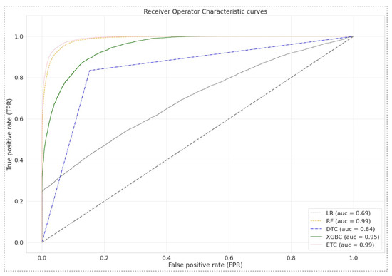 The Receiver Operator Characteristic (ROC) curves for machine learning algorithms are shown in Figure 7. The area under the curve (AUC) values for each model are also indicated, providing a clear comparison of their effectiveness. The AUC attempts to summarize the overall performance of a model in a single number that ranges from 0 to 1. An AUC of 1 means the model perfectly distinguishes between the positive and negative classes (yes, it perfectly discriminates), while an AUC of 0.5 indicates that the model has no real power at all in distinguishing between the classes, and is essentially a random classifier. Better model performance in distinguishing between classes is reflected in higher AUC values. The effectiveness of each FDIA detection model using a ROC curve was demonstrated. Random Forest (RF) and Extra Trees Classifier (ETC) resulted in nearly perfect classification performance. Conversely, Logistic Regression (LR) produced the least favorable result with an AUC value of 0.69. The use of ROC and AUC values provides a more rounded evaluation of the models when compared to simple accuracy statements.