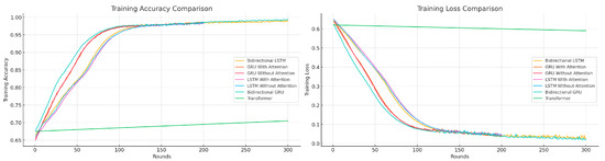 Bi-LSTM-AL and Bi-GRU-AL models demonstrate the highest test accuracy 0.9957 and 0.9977, respectively, indicating superior predictive capabilities. GRU and LSTM models without Attention Layers exhibit slightly lower test accuracy, (0.9879 and 0.9891), showing that Attention Layers enhance the models’ predictive power. Bi-LSTM-AL and Bi-GRU-AL have the lowest test losses (0.007 and 0.0118), reinforcing their reliability in making predictions. The Transformer model has the highest test loss (0.5438), indicating significant challenges in learning patterns in the data effectively. Bi-LSTM-AL and Bi-GRU-AL again lead in precision, recall, and F1-score, suggesting they not only predict accurately, but also balance False Positives and False Negatives effectively. The Transformer model lags significantly in all these metrics, particularly in recall (0.1334), highlighting its difficulty in identifying positive instances correctly. Models with Attention Layers and bidirectional configurations (Bi-GRU-AL, Bi-LSTM-AL) show faster convergence during training, achieving higher accuracy and lower loss over fewer rounds, as seen in the training metrics graph. This trend is consistent with the test metrics, where these models maintain high accuracy and low loss, indicating robustness and good generalization capabilities. Transformer model struggles significantly, suggesting it might require further tuning or might not be as well-suited for the specific federated learning tasks being evaluated. Models like Bi-GRU-AL and Bi-LSTM-AL that perform well in both training and test phases exhibit strong generalization, meaning they do not overfit the training data. This is evident from the similar trends in high test accuracy and low loss, matching their training performance. Adding Attention Layers and bidirectional structures significantly improves the performance metrics across all models. This improvement is most noticeable in models like GRU-AL and LSTM-AL compared to their without Attention Layer counterparts.