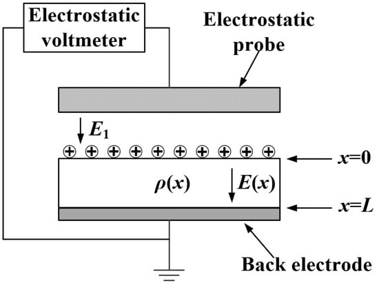 In the process of charge migration, the fundamental laws of electromagnetism are consistently adhered to. Therefore, the relationship between the surface potential decay rate and carrier mobility μ can be derived from the Poisson equation and the current continuity equation. When the surface of the oil–paper insulation carries positive charges, a Kelvin-type probe can be employed to measure the surface potential. As depicted in Figure 1, the probe and the measurement point share the same potential, which implies that the electric field strength in the air gap E1 is zero.