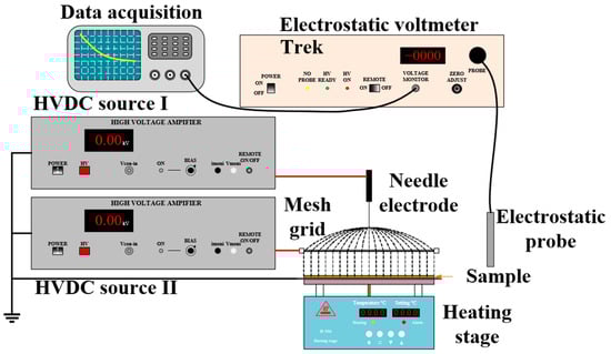 The experimental setup for measuring the carrier mobility in oil-impregnated pressboard, as illustrated in Figure 2, was constructed in this project. To ensure that the surface charges on the oil–paper insulation are of the same polarity and uniformly distributed, a needle-plane electrode system with a grid was utilized in this experiment. The needle electrode has a diameter of 0.3 mm, a tip radius of a curvature of approximately 13 μm, a distance of 5 mm between the needle tip and the grid, and 8 mm between the grid and the sample surface. The needle tip and the grid are connected to two separate DC power supplies, and a thermal platform is used to heat the sample. A Kelvin vibration probe equipped with a high-precision electrostatic voltmeter (Trek-P0865) model number Trek-6000B-5C from Advanced Energy, Inc. in the U.S. was used in the measurement. When SPD measurement is not being conducted, the probe is kept at a distance greater than 40 cm from the sample to prevent damage to the probe during the corona charging process.