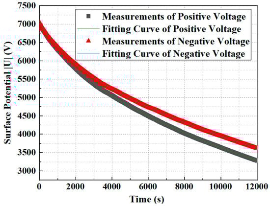 When t is zero, the surface potential is calculated as y0 + A1 + A2. The SPD characteristics of N-Oil-A-impregnated Pressboard W at 20 °C are shown in Figure 3, where the positive and negative surface potentials are +6997 V and −7053 V, respectively.