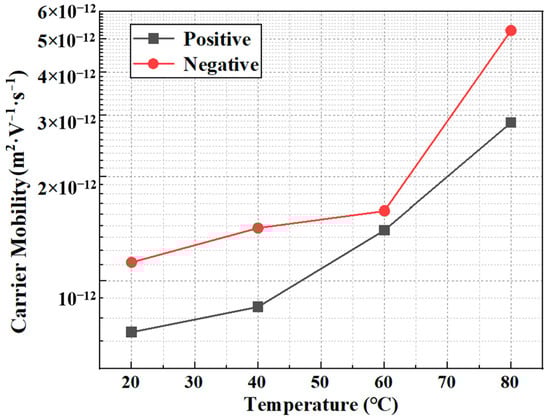 The results from Table 3 and Figure 4 indicate the following: (1) The carrier mobility of both positive and negative charge carriers is in the range of 10−12 m2·V−1·s−1–10−13 m2·V−1·s−1. (2) The carrier mobility of both positive and negative charge carriers shows a positive correlation with temperature. When the temperature increases from 20 °C to 80 °C, the positive carrier mobility increases from 7.11 × 10−13 m2·V−1·s−1 to 2.79 × 10−12 m2·V−1·s−1, an increase of approximately 4.03 times. In contrast, the negative carrier mobility increases from 1.17 × 10−12 m2·V−1·s−1 to 5.26 × 10−12 m2·V−1·s−1, an increase of approximately 4.69 times. (3) The negative carrier mobility is consistently greater than the positive carrier mobility. At 80 °C, the difference between negative and positive carrier mobility is the largest, with a ratio of approximately 1.85, while at 60 °C, the difference is the smallest, with a ratio of about 1.14.