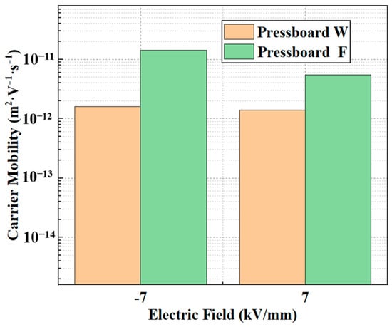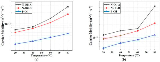 Figure 11. Comparison of carrier mobility of different transformer-oil-impregnated pressboard: (a) positive polarity carrier mobility; (b) negative polarity carrier mobility.