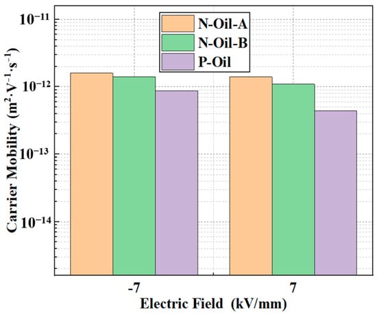 The results from Table 6 and Figure 7 indicate the following: (1) The positive and negative carrier mobilities for Pressboard W impregnated with the naphthenic oils (N-Oil-A and N-Oil-B) are of the order of 10−12 m2·V−1·s−1, whereas the mobilities for Pressboard W impregnated with the paraffinic oil (P-Oil) are of the order of 10−13 m2·V−1·s−1. (2) Pressboard impregnated with N-Oil-A exhibits the highest positive and negative carrier mobilities, which are 1.40 × 10−12 m2·V−1·s−1 and 1.59 × 10−12 m2·V−1·s−1, respectively, followed by N-Oil-B. Pressboard impregnated with P-Oil exhibits the lowest carrier mobility. The positive and negative carrier mobilities of N-Oil-A-impregnated pressboard are 3.16 times and 1.82 times those of P-Oil and 1.28 times and 1.13 times those of N-Oil-B, respectively. (3) There is a significant disparity in the positive and negative carrier mobilities for pressboard impregnated with different transformer oils. For N-Oil-A, the ratio of negative to positive carrier mobility is approximately 1.14; for N-Oil-B, it is around 1.29; and for P-Oil, it is about 1.97. Therefore, the disparity between the positive and negative carrier mobilities is more pronounced for paraffinic oil compared to naphthenic oil.
