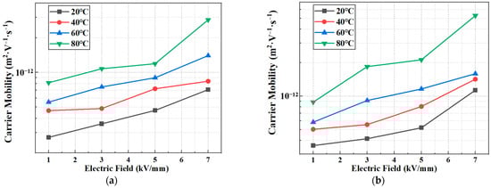 Figure 8. Comparison of carrier mobility at different field strengths and temperatures: (a) positive polarity carrier mobility; (b) negative polarity carrier mobility.