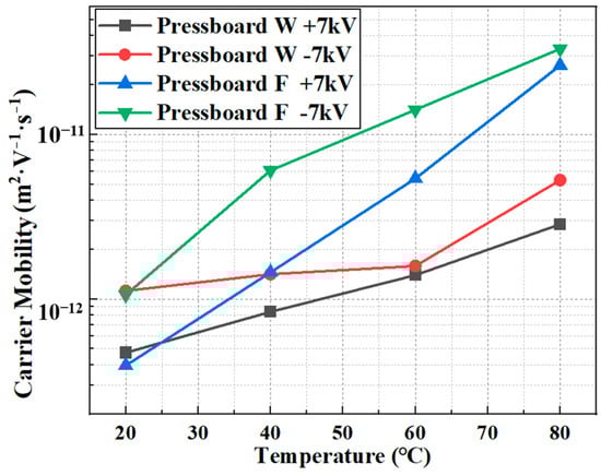 The measurement results of the carrier mobility for Pressboard W impregnated with N-Oil-A at different temperatures (20, 40, 60, and 80 °C) under electric field strengths of ±7 kV/mm are presented in Table 3 and Figure 4.