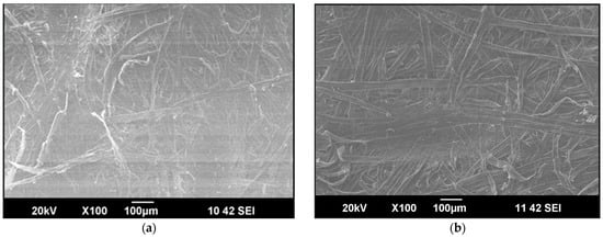 Figure 12. SEM pictures of pressboards from different manufacturers: (a) Pressboard F; (b) Pressboard W.