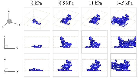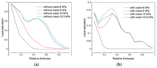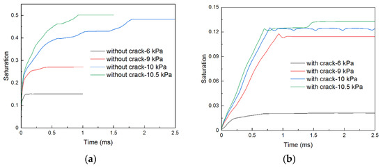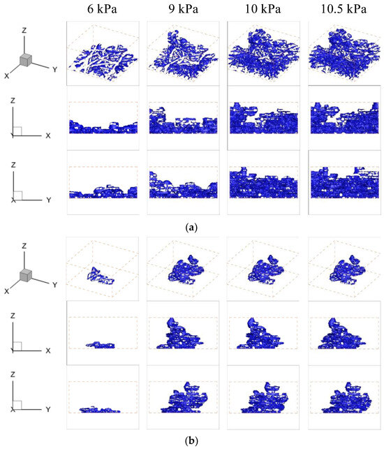 - The method of water introduction significantly influenced the process of liquid water penetration into the GDL. The MPL crack water introduction method caused a reduction in the GDL breakthrough pressure. At the osmotic pressure of 9 kPa, the liquid water could not break through the GDL without cracks but could break through the GDL with a crack. Moreover, the interfacial crack water introduction method had a great influence on the liquid water distribution in the GDL. At a fixed osmotic pressure, the bottom region of the GDL without cracks was completely occupied by water, while the bottom region of the GDL with cracks was partially occupied by water. This simulation result is consistent with the experimental result. The comparison between water distribution and saturation indicates that the MPL crack water introduction method is more consistent with the actual water transport phenomenon in the PEMFC than the water introduction method without cracks.