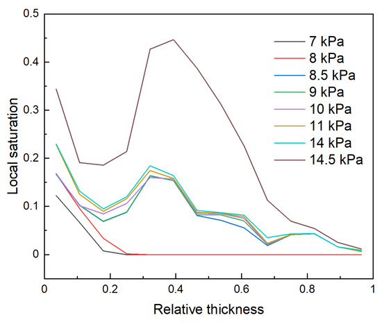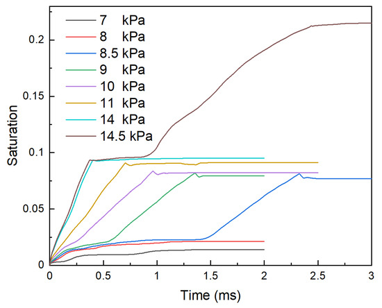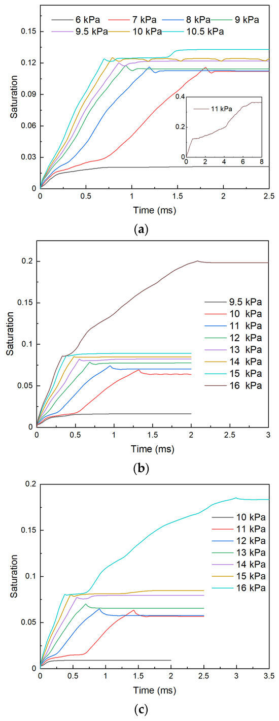 - The liquid water penetration into the GDL in the hydrophobic model requires that the resistance caused by the capillary pressure needs to be overcome. Increasing the osmotic pressure resulted in a faster rate of water penetration, a faster approaching trend to the steady state, and a higher saturation level. When the osmotic pressure did not reach the breakthrough pressure, the liquid water could not overcome the capillary resistance, and as a result it accumulated at the bottom of the GDL. At this moment, the saturation level and the change magnitude were small. The saturation level may change abruptly after the breakthrough pressure is reached. When the osmotic pressure increased from 8 to 8.5 kPa, the saturation growth rate was 256%, with an abrupt change from 0.0214 to 0.0762.