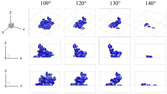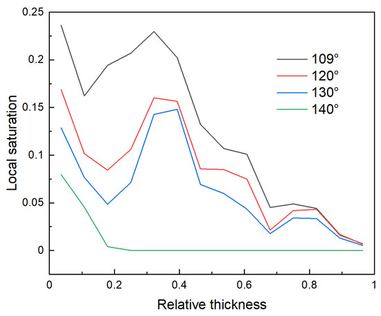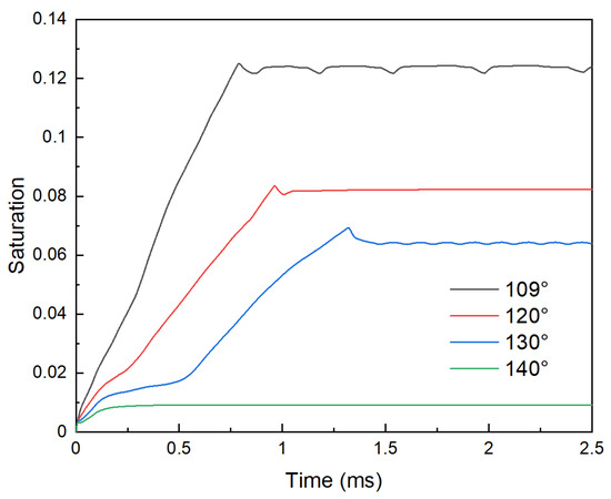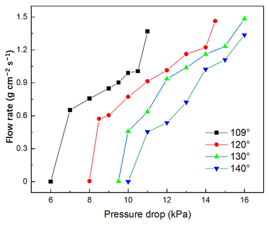 - An increased contact angle resulted in higher breakthrough pressures and secondary breakthrough pressures, and it caused a lower saturation level. At the contact angle of 109°, the breakthrough pressure was between 6 and 7 kPa. When the angle was 140°, the pressure was between 10 and 11 kPa, with a 61.5% increase. The capillary resistance was affected by the increased contact angle, especially in the regions with small pore sizes. As the contact angle increased, the liquid water in the small pores around the transport path initially decreased, causing a saturation level reduction until the GDL could not be broken through.