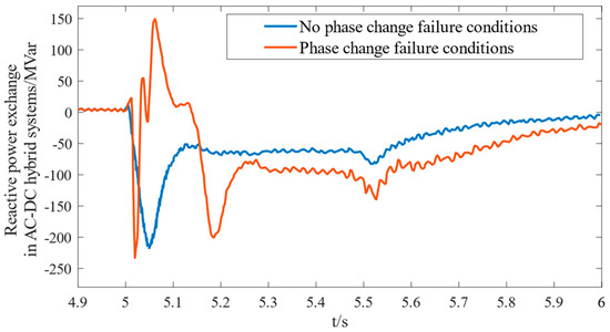The transient process of the DC current during a phase change failure is qualitatively analyzed. In Stage 1, the phase change failure induces Id fluctuations due to a short circuit, leading to significant Qinc variations. As shown in Figure 1a, these fluctuations in Id, being less than the integrated values at both the sender and receiver ends, cause current deviations. These deviations, under the combined actions of shut-off angle control and fixed current control, initiate corrective responses. During this pre-competitive process, the receiving end continues to experience current deviations controlled by the shut-off angle. An increase in γ results in increased Idc and Qinc, while an increase in Id reduces the current deviation, causing γ to decrease along with Idc and Qinc. This continues until the fluctuating Id and fixed current deviation are minimized, allowing fixed current control at the sending end to dominate, at which point Qinc reaches its minimum. In Stage 2, both the sending and receiving ends operate in constant current control mode, causing Idc and Qinc to rise slowly. In Stage 3, Qinc reaches its maximum value during the fault phase, enters a fault steady state, and reverts to constant blocking angle (fault steady-state value) control. Subsequent stages mirror the conditions of non-phase-change failure and will not be detailed here. The Qac-dc waveform of reactive power exchange in the AC/DC hybrid system under both conditions is illustrated in Figure 2 [22].