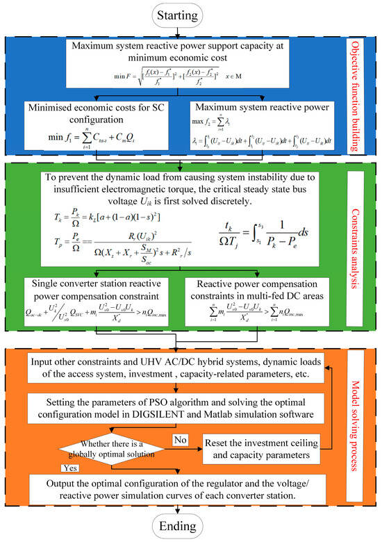 Therefore, this study begins by qualitatively and quantitatively analyzing the dynamic characteristics of DC reactive power and induction motors under AC faults. The sub-transient and transient reactive power output model is established to describe the SC output characteristics, elucidating the coupling relationship between the SC’s reactive power output and the DC reactive power demand at different time scales. Subsequently, a critical stabilized voltage index for dynamic loads is defined, and the SC’s reactive power compensation target is quantitatively calculated across different time scales, revealing the impact of transient changes in DC reactive power on the transient voltage stability of the multi-fed DC environment with dynamic load integration. Finally, an optimal configuration model for the large-capacity SC is proposed under the critical stability constraint of dynamic loads to maximize the SC’s reactive power support capability at the lowest economic cost.