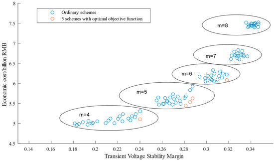 It is evident that at least four SCs are required in the system to meet the transient stability requirements of the AC/DC hybrid system. It is impractical to excessively improve the transient voltage stability margin at a significant additional economic cost. Therefore, this paper aims to minimize the Euclidean distance, balancing economic benefits and transient voltage stability while ensuring safety. The five most-preferred schemes are shown in Table 6.